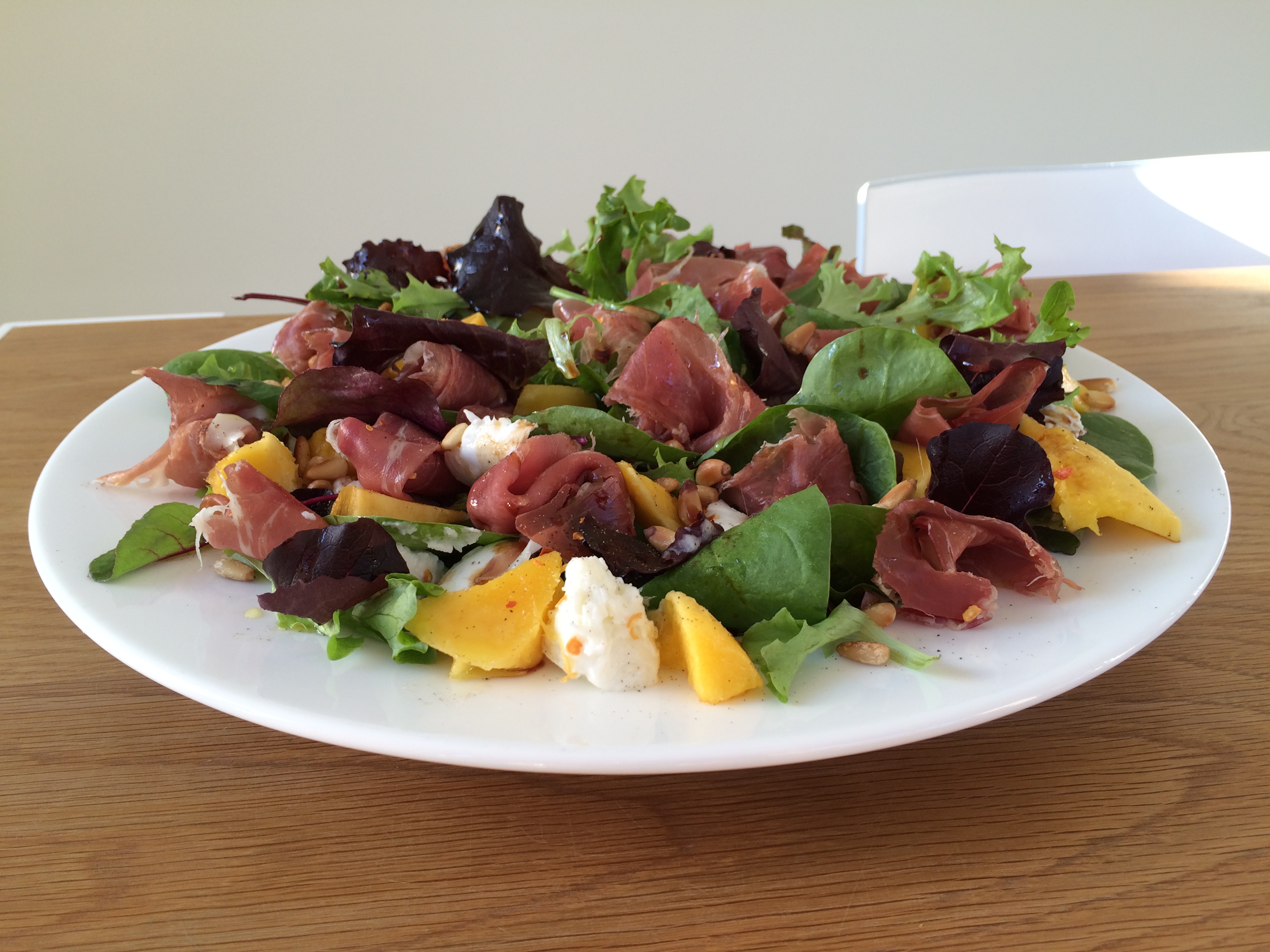 You can vary the quantities depending on how many people you’re serving. To give you a guide I tend to find, to serve 4, a bag of salad leaves, 1 ripe mango, 2 balls of mozzarella and 1-2 packets of Parma ham is enough. You’ll also need some pinenuts, dried chilli flakes, lemon olive oil and balsamic vinegar.